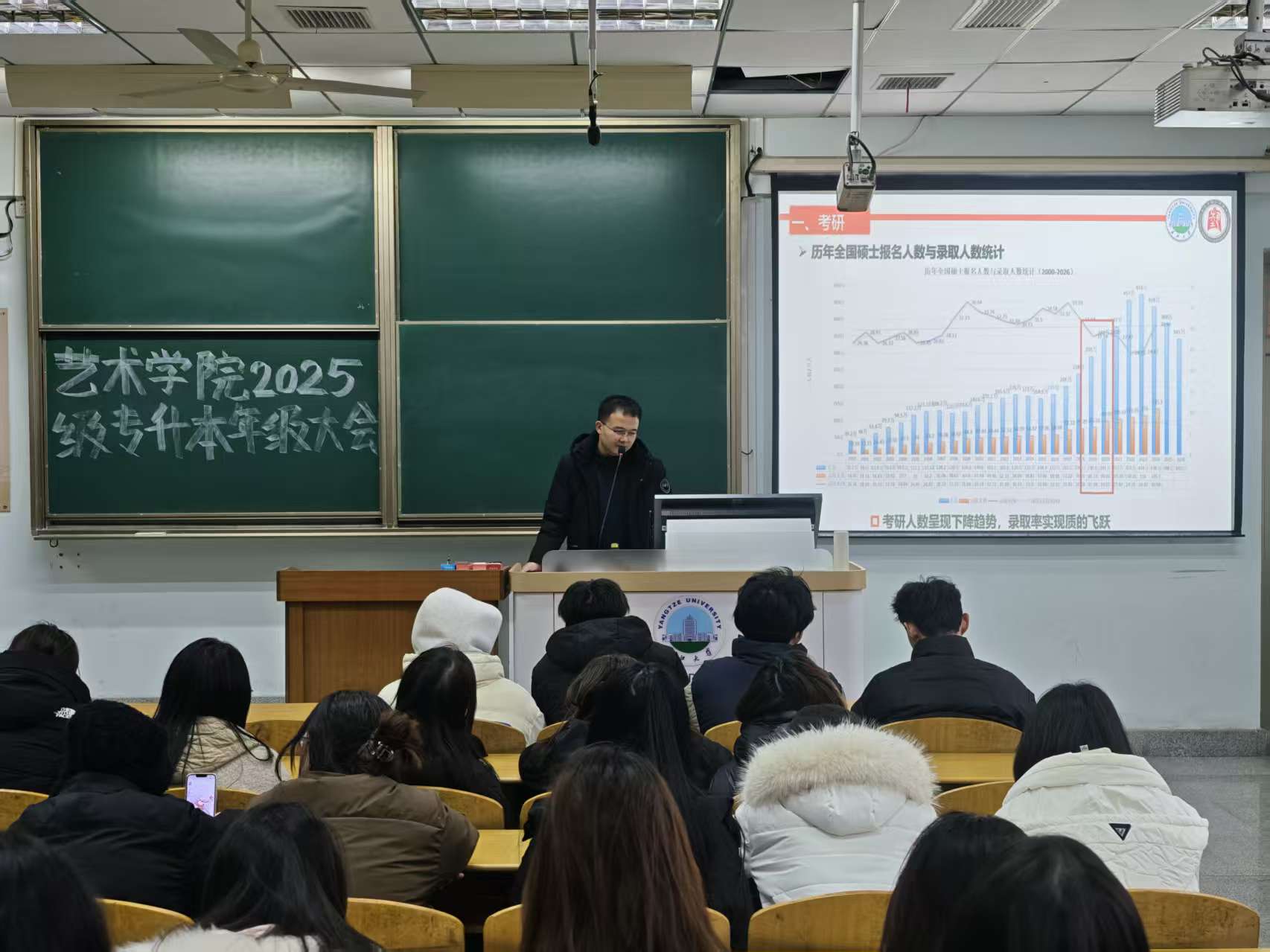 (通讯员 张慧君)为切实做好学生元旦假期安全教育与生涯规划指导工作,12月24日下午,艺术学院在12教D225教室组织召开2025级专升本年级大会。本次会议由辅导员孙岳主持,学院党委副书记何曼出席并开展考研专题辅导,2025级全体专升本学生参会。