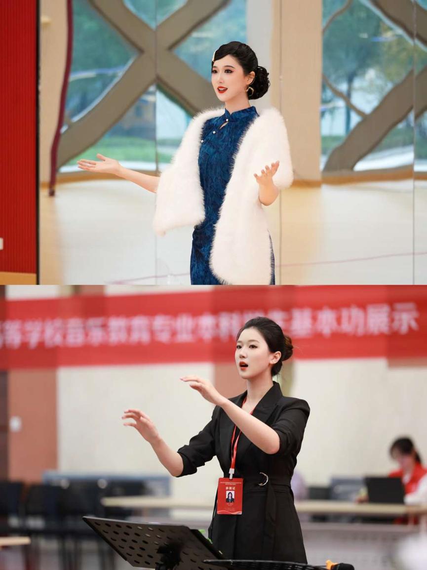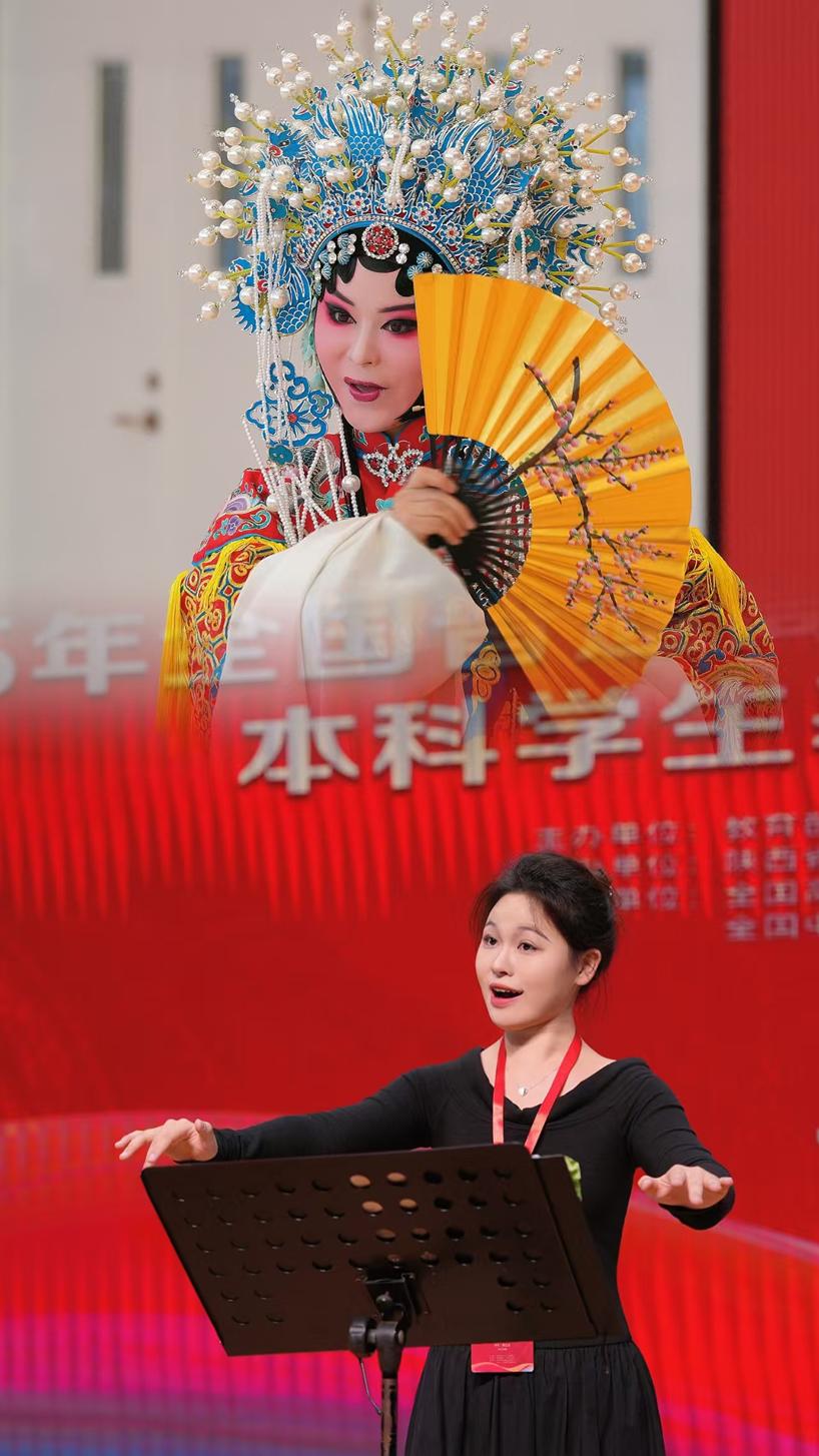 胡慧玉演绎传统戏曲选段,唱腔清亮、身段传神,具象化传统艺术与音乐教育融合路径;徐菲悦呈现戏剧独白片段,凭饱满情感展现表演功力;宋孟芽表演古典舞,身段柔美、韵律精准,诠释东方审美。团队在合唱指挥抽题环节沉着应对,即兴弹唱以灵活转调、适配织体获认可。