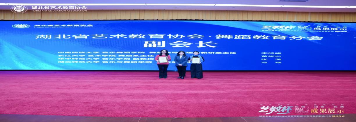 在湖北省艺术教育协会聘任仪式中,我院聂贞萍教授、梁明明教授被聘为湖北省艺术教育协会音乐教育分会副会长,舞蹈系主任董柳莎副教授被聘为湖北省艺术教育协会舞蹈教育分会副会长。