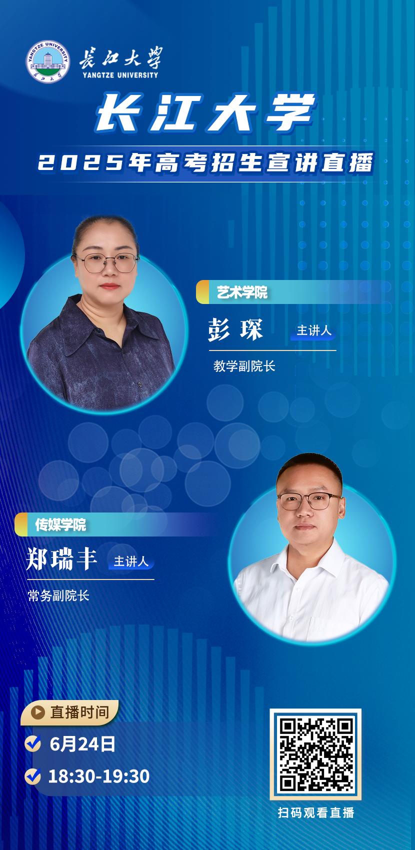 2025年6月24日6点30分,长江大学艺术学院2025年高考招生宣讲直播准时开播。此次直播为有意报考该院的考生提供了解学院的契机,欢迎广大考生密切关注,可通过扫描海报内二维码进入直播间观看。