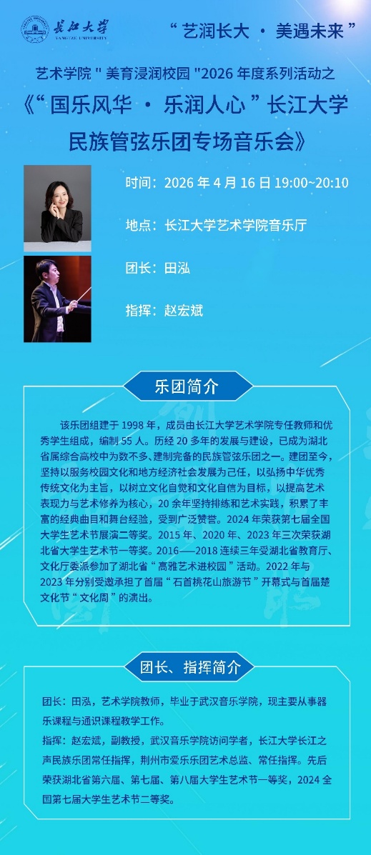 为深入贯彻落实新时代高等教育人才培养“五育并举”要求,全面落实立德树人根本任务,长江大学艺术学院以“艺润长大・美遇未来”为主题,以“美育浸润校园” 2026年度系列活动为载体,面向全校师生开展艺术展演实践类、艺术素养普及类、艺术技能提升类三大版块活动,通过展演实践锤炼审美创造能力、以素养普及提升审美鉴赏水平、以技能提升强化审美感知能力,切实发挥美育培根铸魂、启智润心作用,以美育人、以美化人,全面赋能校园美育建设,助力培养德智体美劳全面发展的时代新人。