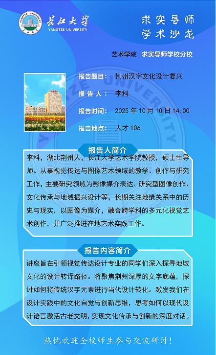 上一条:艺术学院成功举办“求实导师学术沙龙”——郁郁乎文哉:荆州汉字文化的设计复兴