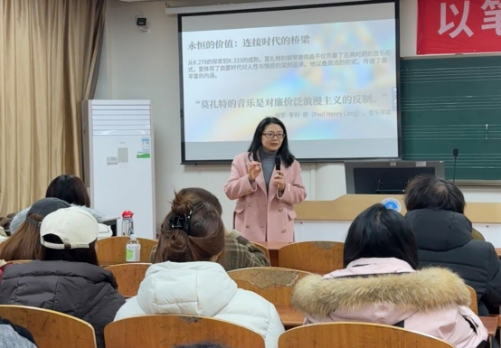 (通讯员朱琼)2025年12月23日晚19:00,在长江大学艺术学院Y210教室,成功举办了“求实导师学术沙龙”--莫扎特钢琴奏鸣曲中的音乐语言分析。本次活动由朱琼副教授主持,以莫扎特三首代表性钢琴奏鸣曲K.279、K.330和K.333为研究对象,从创作背景、曲式结构、和声特点及演奏技巧等多维度进行了系统分析。活动现场座无虚席,师生反响热烈。