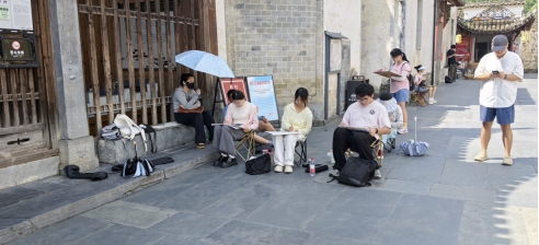 在安徽,师生首站走进西递古村,学生聚焦徽州三雕、“四水归堂”建筑特色,融入村民生活场景创作。教师明确“每日写生+晚间点评”节奏,通过“日间实践+夜间复盘”帮学生及时消化所学。