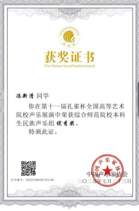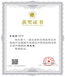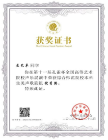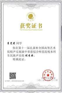 在第十一届孔雀杯全国高等艺术院校声乐展演中荣获综合师范院校本科生民族声乐组优秀奖。这次经历是我大学生涯中浓墨重彩的一笔。它让我深刻体会到团队支持的力量和个人坚持的重要性。从备战到站上舞台,每一个环节都是成长。这份荣誉属于集体,属于每一位给予我帮助的人。我将珍藏这份鼓励,将其化为前进的动力,在未来的艺术追求中继续保持热爱,坚守初心,勇攀高峰。