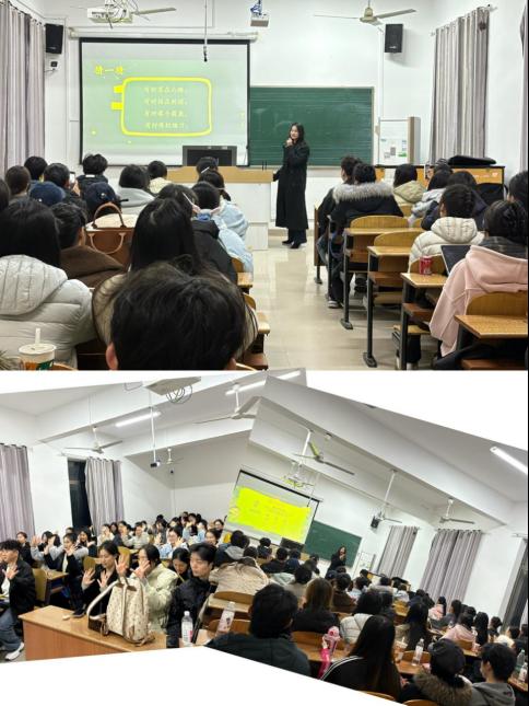 接着,邓玉轩以公开课的形式向大家展示了她在实习过程中的教学收获,通过猜谜、动画、手势舞等形式将音乐与舞蹈融合教学。其精心设计的课堂环节既体现了教学巧思,又充分调动了参与感,不仅展现了优质课堂的构建逻辑,更成功点燃了在场23级学生的学习兴趣,为他们提供了可借鉴的课堂设计思路。