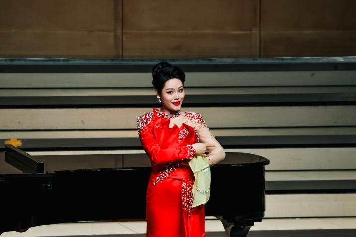 音乐会共演绎了13首作品,分为古诗词艺术歌曲、地方民歌、歌剧选段、戏曲四个板块,曲目选择兼顾了学术性、艺术性与多样性,风格迥异,七彩纷呈,整体呈现出较高的艺术水准。在古诗词艺术歌曲板块中,赵陈竹演唱的《竹枝词》《菩萨蛮·小山重叠金明灭》《红绣鞋·欢情》等作品,音韵婉转,意境深远。她以细腻的情感处理与得当的声音控制,将古典诗词的文学内涵与音乐韵律巧妙融合,形神兼备,展现出对国风古韵的个人化深层理解与诠释。地方民歌及创作歌曲板块则充分体现了赵陈竹驾驭不同地域音乐风格的能力。无论是湖北乡土气息浓郁的《月儿落西下》,还是山东民歌《包楞调》、河南风格浓郁的《没有强大的祖国,哪有幸福的家》,她都能精准把握各地民歌独特的语言韵味与音乐特质,演唱得韵味十足,风情万种,具有鲜明的风格辨识度,赢得了观众的阵阵掌声。在展现戏剧张力与声音控制的歌剧选段部分,赵陈竹以饱满的情感和富有穿透力的声音,精彩演绎了《情话》《哥哥不来花不开》等经典歌剧选段。她的演唱不仅展现了扎实的演唱技巧与声音表现力,更透露出对作品人物情感与艺术内涵的深入解读,显示出向更高艺术层次迈进的潜力。尤其值得一提的是,音乐会上赵陈竹还挑战了三首戏剧选段,有京剧《卖水》、《叫张生》还有一段沪剧《燕燕做媒》。她以清晰的字韵、颇具韵味的行腔和生动的表演,展现了在戏曲唱腔方面的学习与探索,为整场音乐会增添了别样的色彩,也体现了其开阔的艺术视野和勇于尝试的精神。特邀嘉宾肖健的助演,也为音乐会增添了亮点。整场演出在观众持久不息的热烈掌声中圆满落幕。