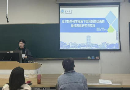 熊梓钰以“皮尔斯符号学视角下克里姆特绘画的象征表意研究与实践”为题进行汇报,以皮尔斯“像似符-指示符-规约符”三元模型为核心理论,分析克利姆特绘画的装饰美感与象征内涵,结合《吻》等作品解读符号动态衍生过程精选讲述,同时呈现个人创作《花系列》对克利姆特符号、材质、空间语言的借鉴转译,兼具理论深度与实践价值。